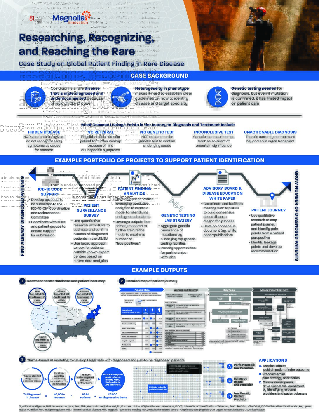Finding patients can appear to be an insurmountable challenge for companies working to bring therapies for rare conditions to market, particularly early in development and before a full team is in place. Our team of market researchers, data scientists and consultants built a patient finding strategy tailored to our client’s needs that combined consulting expertise, primary research, and data analytics.
